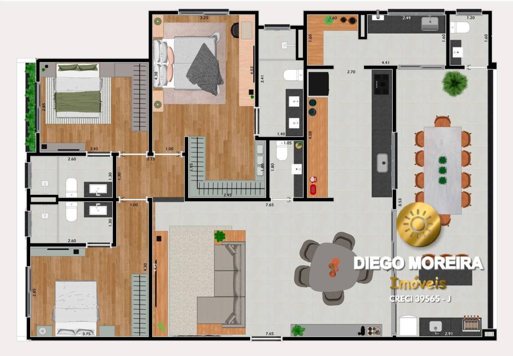 Apartamentos com 3 suítes, sendo a suíte master com closet, sala para tv, sala de jantar, cozinha, varanda gourmet integrada, lavanderia, despensa, lavabo, 2 ou 3 vagas de garagem, depósito (ver tabela).