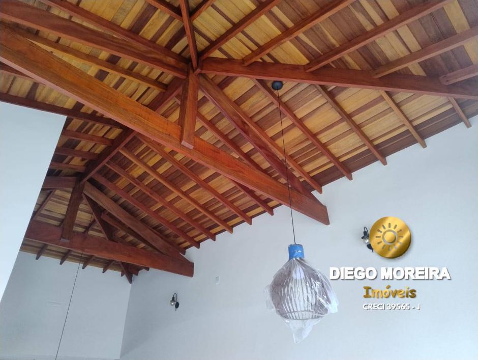 salas de estar e jantar integradas com pé-direito alto, forro e tesouras aparentes em cedro